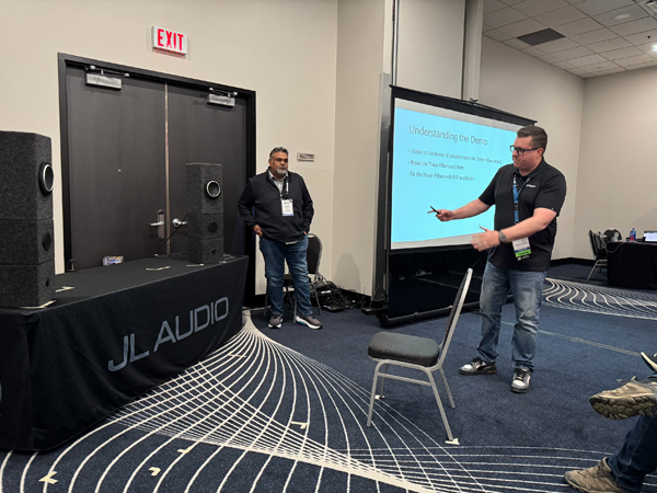 Continuing “Rob Haynes, from Garmin/JL Audio, was the busiest trainers at the CMA Expo presenting 5 classes over the weekend. One of Rob’s key trainings was a live demonstration on how proper system design and as 10 minutes of tuning could make an unbelievable difference. A demo setup allowed attendees to listen to speakers in a perfect layout,..then moved the speakers around just like they would be positioned in a car which made them sound terrible and then applied DSP which made the whole system sound like it did when the speakers were setup in a perfect position.”