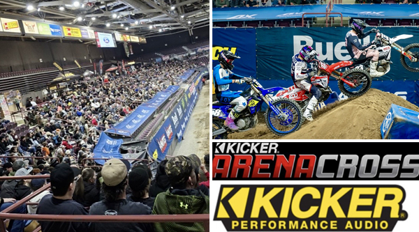 Morrell, who orchestrates the AMA ArenaCross events, related “It was a great night of action. Saturday night the arena was packed. The Pit Party drew enthusiasts onto the track to get the evening started. The line was backed up to the lobby as people waited to get onto into the Pit Party. Meeting riders and checking out their bikes was enjoyable for all. The KICKER booth in the lobby area had tables with products displayed for car, truck, marine and motorsports. Some of the products were the first time on site at an ArenaCross.”