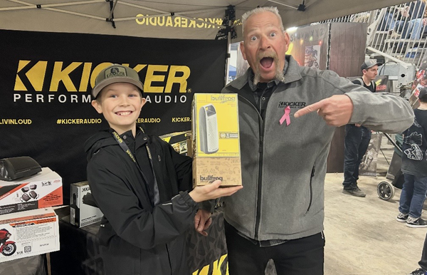 “As with ArenaCross events across the US there was so much excitement with attendees at the event at the Toronto Centre. We had a chance to show many new KICKER products as attendees spent time in our booth. In addition, there were a large number of KICKER banners around the track plus the PA announcers spotlighted to KICKER brand and announced the T-shirt toss contest. One of the wrapped KICKER T-shirts had a certificate for a free KICKER BULLFROG to be picked up at the booth and a happy young man and his family came by to pick up the BULLFROG. Having Dave and Mike in the booth was terrific” Morrell stated.
