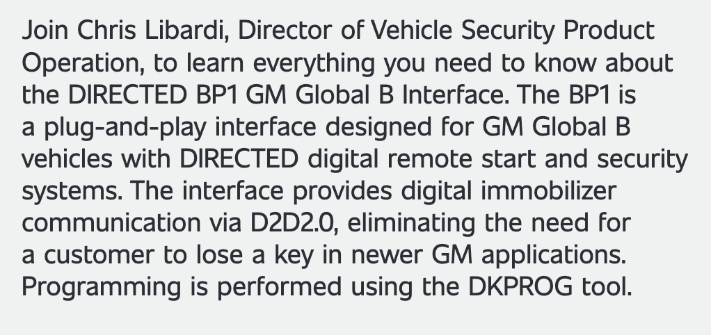 ORLANDO, FL (01.14.26) – Join Directed for a targeted training session designed to help you get up to speed on the new DIRECTED BP1 GM Global B Interface. This session provides practical guidance on system integration, installation efficiencies, and programming workflows.