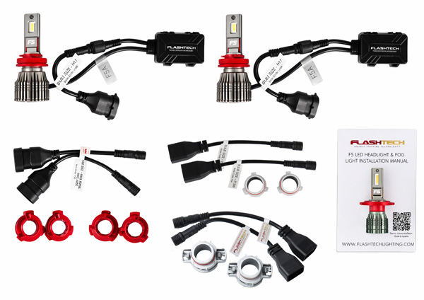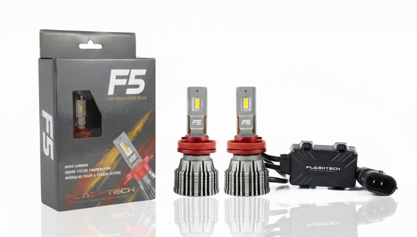 The F5 platform produces 6,000 lumens and utilizes an optimized aluminum heat sink for sustained thermal management and long-term performance. The full F5 lineup includes the F5A single-beam in 6000K pure white, the F5A single-beam in 3000K golden yellow (optimized for fog light applications), the F5B dual-beam hi/low in 6000K, and a dedicated non-modular H4 dual-beam in 6000K for H4/9003/HB2 applications. Every kit ships in custom Flashtech retail packaging, shelf-ready out of the box.