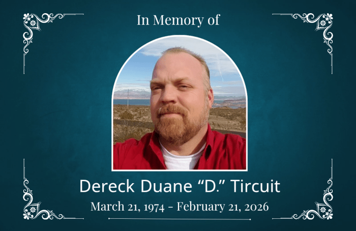 HOUMA LA (03.21.26) Dereck Duane Tircuit, known and loved by many simply as “D,” passed away on Saturday, February 21, 2026, at his home in Prairieville, Louisiana, at the age of 51. He was born in Baton Rouge, Louisiana, on March 21, 1974. He was preceded in death by his father, Albert N. Tircuit; his maternal grandparents, Eugene Roe Sr. and Vera Hunt Roe; his paternal grandparents, Leonard “Boots” Tircuit and Genevieve Grass Tircuit; his aunt, Jenny Tircuit David; his uncle, Leonard G. Tircuit; his cousins, Travis and Kristie David; and his beloved fur babies, Kramer G., Gabby, and Deuce.