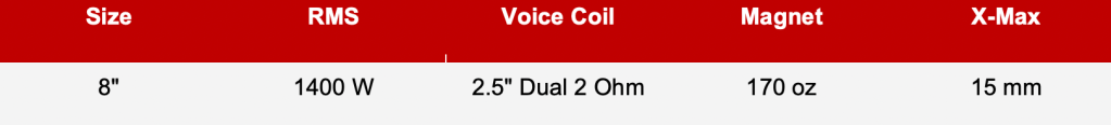 - 8″ subwoofer rated at 1400 watts RMS / 2800 watts peak.