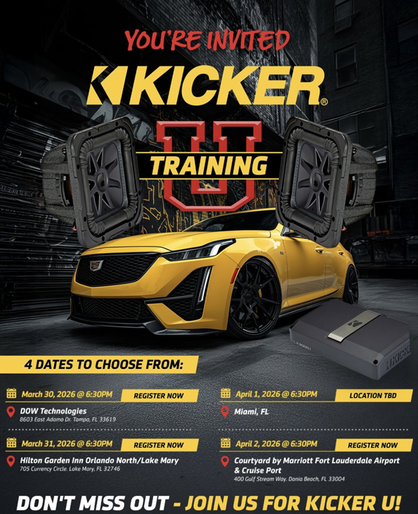 TAMPA, FL (04.03.26) – DOW Technologies hosted the 4-City KICKER U Training TOUR In South Florida from March 30th through April 2nd. The KICKER U Training series included stops in Tampa, Orlando, Miami, and Fort Lauderdale.