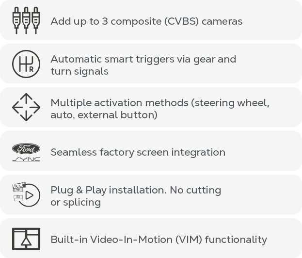 The ZZC-SY4C is already a powerful solution for adding front, side and cargo camera visibility directly to the factory screen. Now, with expanded SYNC 3 compatibility, you can offer this upgrade to an even wider range of Ford vehicles.