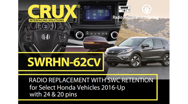 RESEDA CA (08.11.25) – The CRUX SWRHN-62CV is a premium radio replacement interface designed for select amplified & non amplified 2016-Up Honda CR-V vehicles with dual 24-pin factory & 20 pin connectors. It enables seamless installation of an aftermarket radio while retaining essential factory features—including steering wheel controls, the multi-angle rearview camera, lane watch camera, factory auxiliary input, and USB functionality.