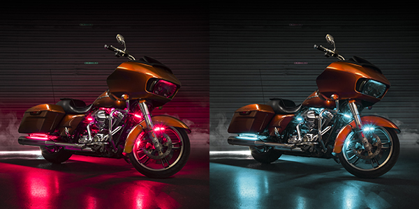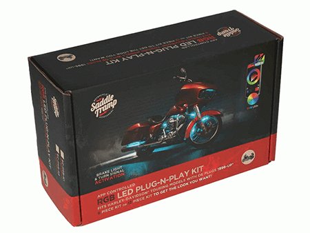 - Pre-wired LED strips for headlight trim, front fender, crash bar, gas tank, back engine, saddlebags, and Tour Pak