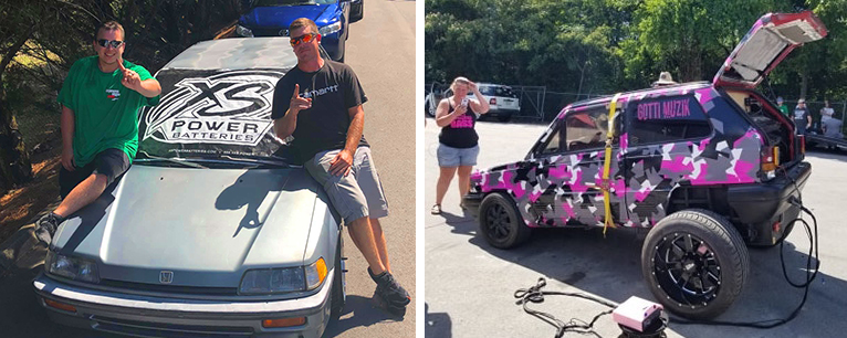 LEFT: 2 guys on hood of blue Honda: Shawn Mayo and Matt Holloran say XS Power Batteries are Number 1. RIGHT: Kyle Eberle’s Pink and Gray Camo Car is definitely one of a kind.