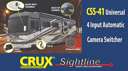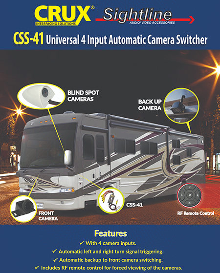 CHATSWORTH, CA (12.30.2019) – CRUX has introduced the CSS-41 – a universal 4 channel video switcher made for front, rear, & side-view cameras for OEM & aftermarket infotainment systems.