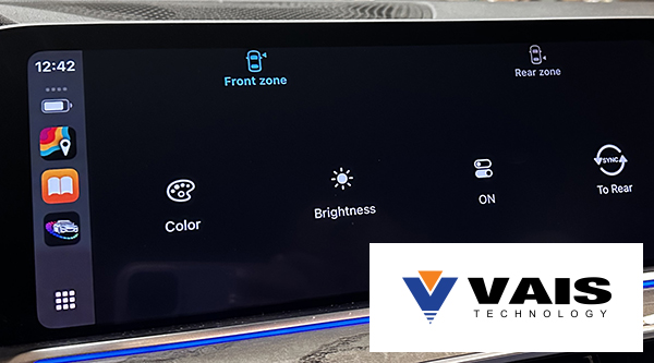 ENGLEWOOD, CO (10.28.24) – VAIS Technology has introduced CarPlay support for its Ambient Lighting Kit p/n AL6-K01. This enhancement allows users to manage the ambient lighting directly from either factory-installed or aftermarket radios. The controls provided enable users to adjust both the color and brightness for the front and rear zones independently.