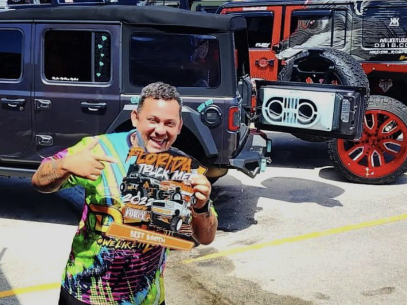 Rob Ferro, Mr DS18, happily shows the Best Jeep Award the company took home from the Florida Truck Meet.