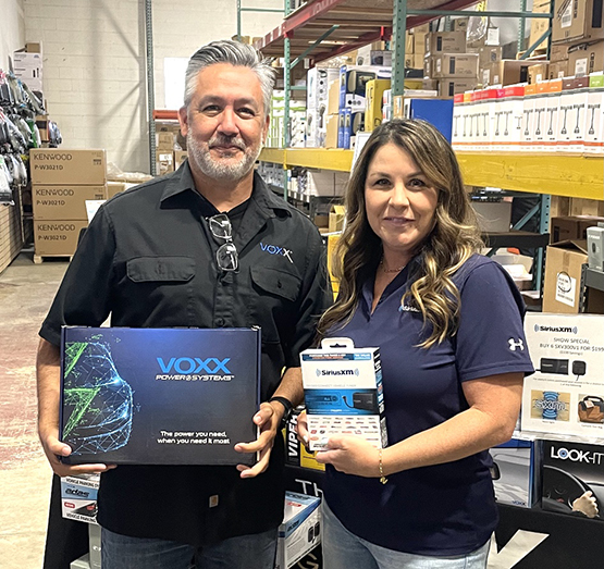 SiriusXM‘s Nina Contreras and Airon Ayala from VOXX Electronics pictured with products from their respective brands in the warehouse.