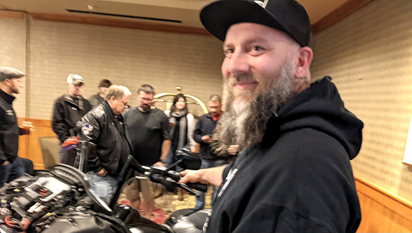 Sam Walker is all smiles and dealers check out his Harley Road Glide build.