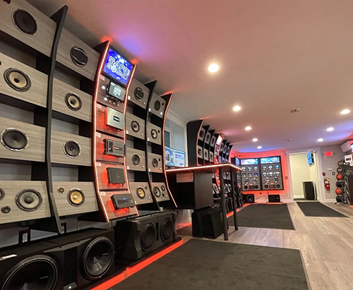 Home AV products are displayed in separate rooms and showroom areas. Large screen monitors and lighted graphics make every inch of the showroom come alive. With the latest technology, every car audio and Home AV speaker in the showroom can play the same music at the same time. Talk about an in-store experience!