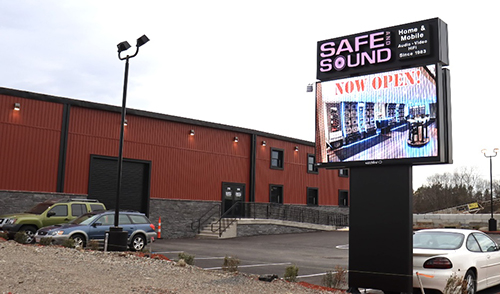 This large digital sign lets all know Safe & Sound is open in their new Chicopee location.