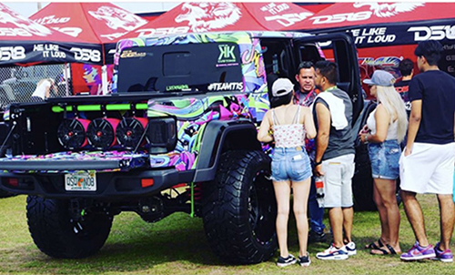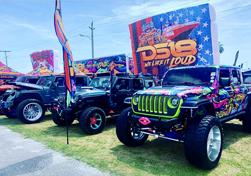 DS18 had a mega presence at Jeep Beach where they showed and let all hear “We Like It Loud”. Over a dozen decked out Jeep demos drew a full house each day, The DS18 trailer, featuring a live showroom, was also in the expansive booth area. Rob Ferro, Mr DS18, was in the house with the standout Exotica demo with a stunning full wrap. At an evening ceremony he also received the Jeep Beach ‘Jeep Beats’ First Place Vendor Award.