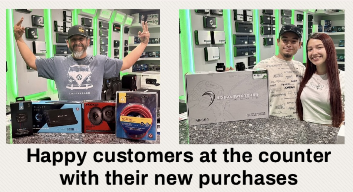 The in-store experience continues as customers are spotlighted at the sales counter with the products they just purchased. In the background the impressive showroom display is visible. All customers have happy smiles on their faces for the image that will be in a 559 Car Stereo post.