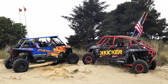 The Brad’s Car Tunes RZR (L) and KICKER RZR were both Livin’Loud on the dunes.