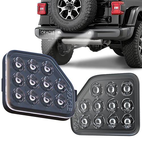 “A common complaint we hear from JL owners is low visibility when backing up at night,” said Justin Hartenstein, Oracle Lighting director of development. “There is not enough light from the reverse lights, even on the LED tail lights, for the factory camera to work well in the dark. We have developed a reverse light which seamlessly integrates into the bumper reflector area to provide more than 1,000 additional lumens when backing up at night. Utilizing a total of 22 high powered 3W LEDs, these small lights pack a big punch!”