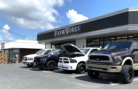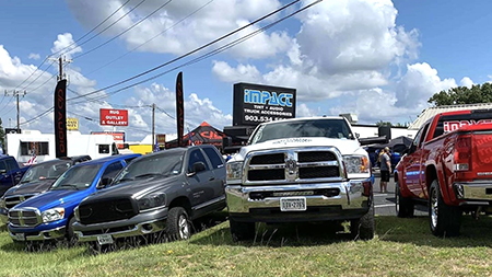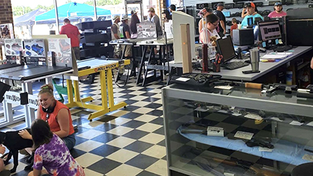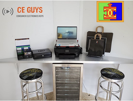 CE GUYS are set up under a SounDigital tent at the Ride and Rest Campground. The trailers, with tools and inventory, are positioned adjacent to the tent where the sales and installations are taking place.