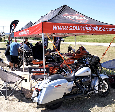 Foundation related “The Sturgis Rally is such an amazing event. Our team is here with multiple goals. First is the drive to support the Cameron and Connor Autism mission. To that end a campaign was launched for the Cameron and Conner Autism Custom Bagger Raffle. DA Performance is creating a work-of-art and we are selling raffle tickets and apparel here at the event. All proceeds go to the Cameron and Conner Autism initiative. In addition we are selling SounDigital and products plus installing systems for bikers looking to upgrade their rides for the trip home. We are working underneath a large SounDigital tent with inventory stored in the trailers. We have large banner signage on the trailers to grab the attention of bikers traveling around the Ride and Rest Campground. There are over 4000 bikers staying at this campground.”