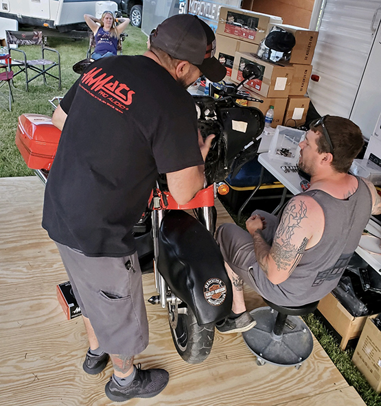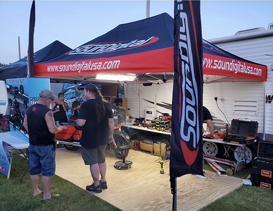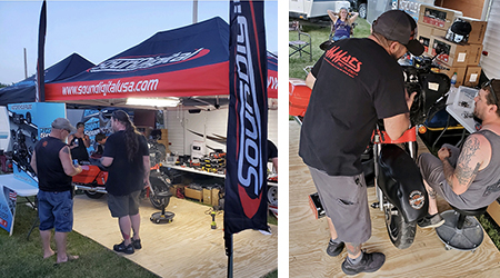 Michael Foundation, CE GUYS, travelled the 594 miles from his Chicago area base pulling a 34’ trailer to work the event. The trailer was loaded with the event tents and products for the event. CE GUYS’ brands SounDigital, Ground Zero, Metra, MMATS PRO Audio, Braille Battery and Beyma were showcased at the venue. Gus Rigas made the trip with Foundation and worked to install gear on the bikes.
