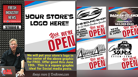 A ‘Yes We’re Open’ graphic offer was made by the 12volt News. The offer …Send us you logo and, using a custom ‘Yes We’re Open’ template, staff will prepare a graphic 12volt retailers can post on their social media outreach. On Monday, June 8th, 12volt Central Studios sent ‘Yes, We’re Open’ graphics to 4 12volt retailers. The Soundshop in SoCal, Broken Silence in Greenwich CT, Aspiring Audio in Cincinnati and Car Sounds in the Netherlands were happy to receive their graphics.
