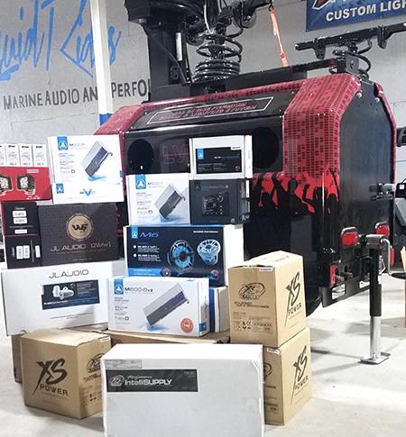 JL Audio and XS Power equipment pictured ready to be installed in a Audio Party Tower.