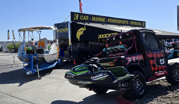 Continuing “ KICKER’s Western Regional Tracy Focht was on site. Focht worked with area rep Steve Parsley with Murphco, area dealers and members of the crowd. Products and a decked ski rig were under the XRV awning and had eyeballs all day. The Kawasaki Ridge and Jet Ski gave enthusiasts ideas. Three helicopters were flying overhead to highlight the action through the days.”