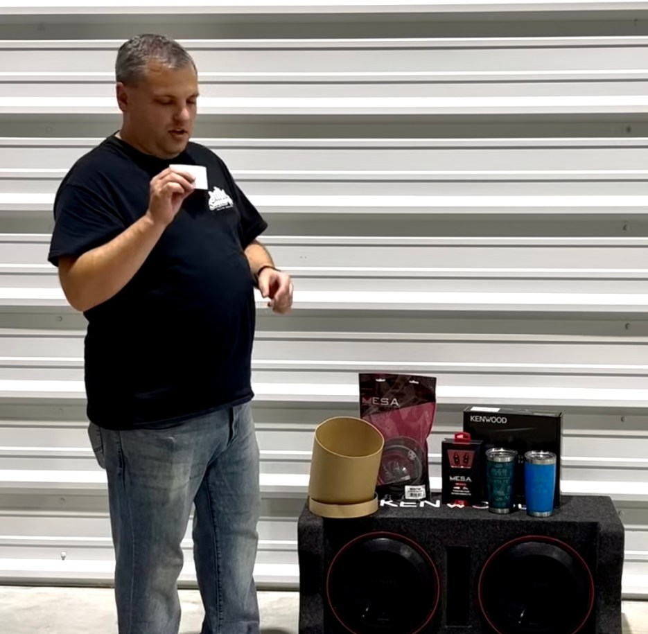 There were multiple giveaways that included caps, key chains, koozies, T’s plus a drawing for a grand prize a Kenwood eXcelon P-XW1221DHP, loaded Kenwood dual 12″ subwoofer enclosure with amplifier and installation valued over $1000. The 2 Yeti koozies were custom engraved.