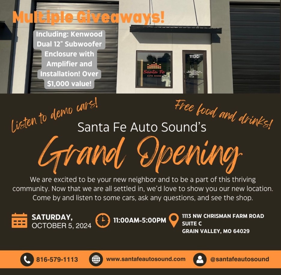 Santa Fe Auto Sound’s new from the ground up location in Grain Valley will celebrate the Grand Opening on Saturday, October 5th from 11AM until 5PM. The location’s showroom and expansive installation area will be spotlighted along with demo vehicles. There will also be multiple giveaways including a loaded Kenwood dual 12” subwoofer enclosure with amplifier and installation valued at over $1000.