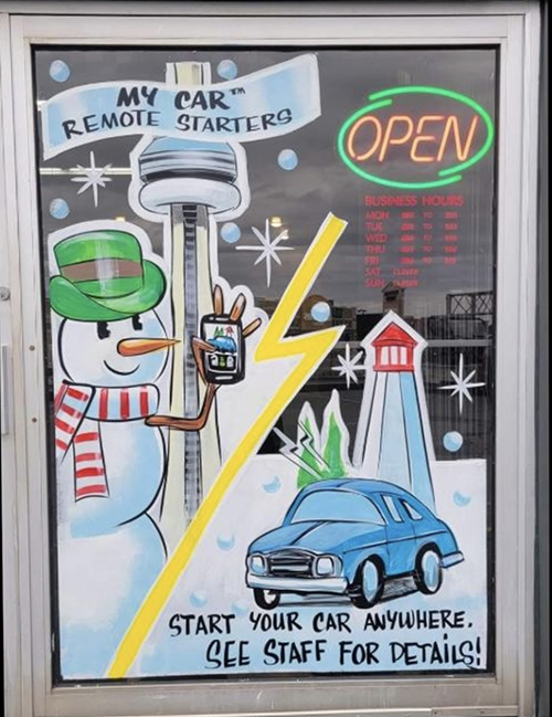Periodically, the full graphic on the store door is changed. The newest graphic celebrates the company”s 40th Anniversary. The previous graphic brought attention to the remote starter season.