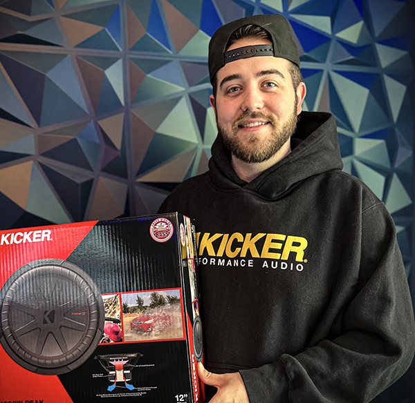 Sam Sutton is holding a KICKER CWR12 Subwoofer and Livin’Loud in the Crossover Marketing HQ in Portland OR.