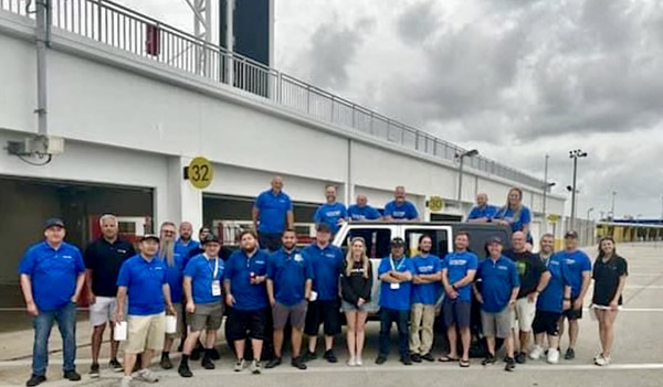 The Alpine, SoundWaves of Tampa and DOW Technologies teams gathered for a Jeep Beach photo op by the NASCAR Garage install bays.