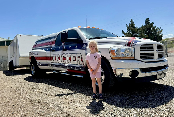 DJ’s daughter met Lorin’s monster RAM that pulled trailer loaded with KICKER Livin’Loud Monster Show gear.