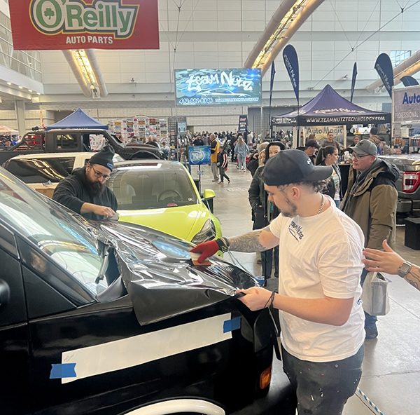 Blake Paul working on a vinyl wrap for a demo vehicle.