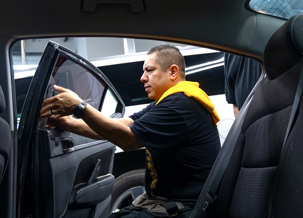 Robert is working carefully on this window tint installation.