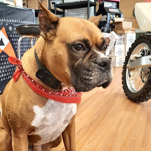 Gunner, the friendly boxer, greets customers at the door.
