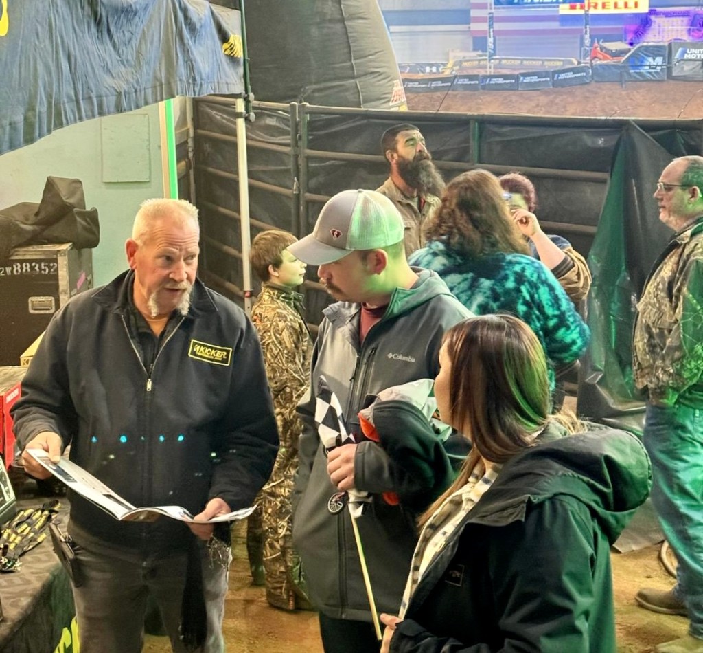 Lorin Morrell talking with enthusiast about KICKER products in the company’s booth.