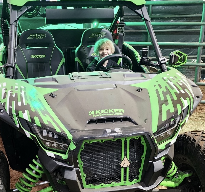 This happy youngster got the thrill of sitting in the loaded KICKER Kawasaki early Friday night.