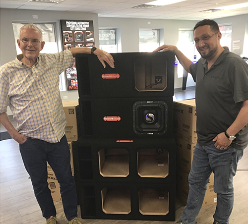KICKER’s Steve Irby (L) stopped by Armando Sounds and checks out new SOLO X subs with Mohammed Arman in Niles, IL.