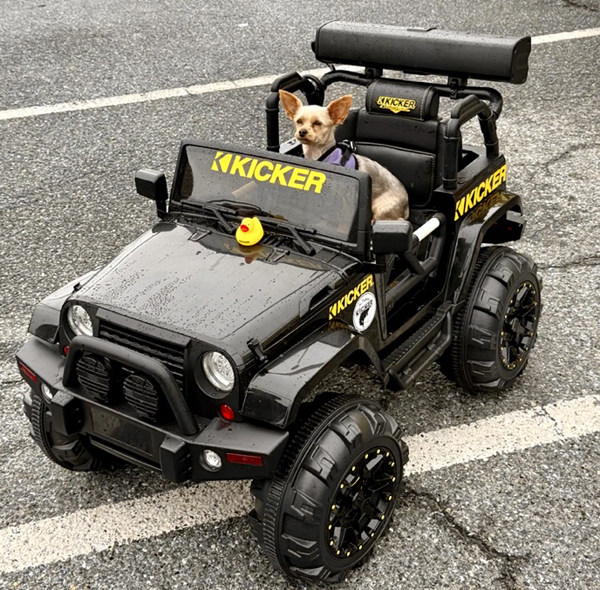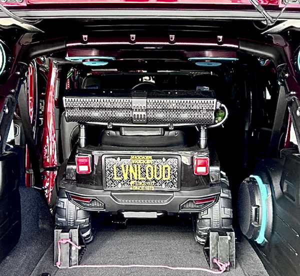 “I have worked on many custom Jeep projects.. this one a special prize for a youngster. For the KICKER Sound Bar with Bluetooth we added a lithium battery. We placed KICKER decals around the body in Jeep fashion. The seats received custom embroidered KICKER logos and added fog lights, that actually work, plus a custom Livin’Loud license plate. I actually removed and hand-painted the bolts on the hub caps. Once completed it was ready for us to take to Ocean City in the back of my wife’s Jeep” Weidmoyer related.