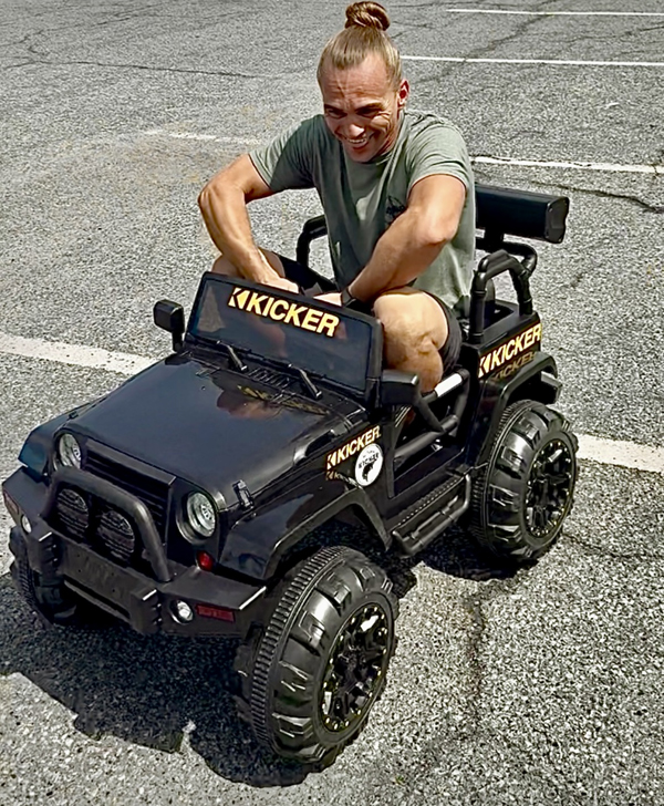 The lucky raffle winner, Bill, is all smiles as he sits in his KICKER Power Wheel Toy Jeep.