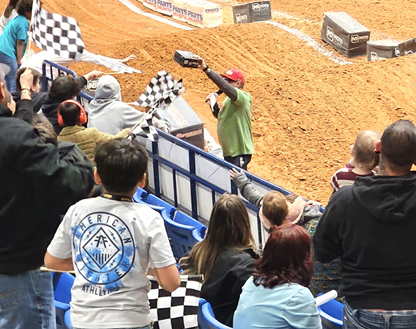 Once the racing began riders were flying high over the mounds and navigating the tight turns on the track through the race segments. During breaks between races Wes Kain was on the PA mic encouraging crowd members to wave their checkered flags. As a special offer Kain awarded KICKER Personal Audio headphones to the best flag wavers.