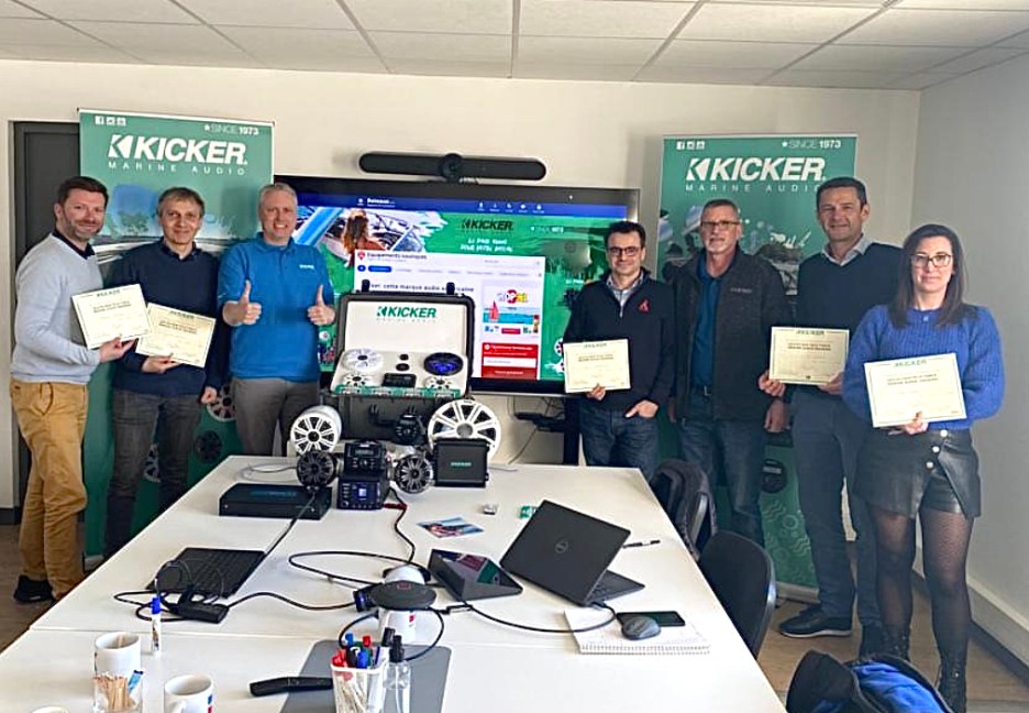 The Day-1 KICKER product training roadshow took place at Kent Marine Equipments location in Nantes France on Monday, February 27th. “It was an incredible first day of the training roadshow. There were 5 Kent Marine staff members in the meeting room. Aaron conducted a very informative meeting. David and Mike worked to set up all the gear in the meeting rooms. Kent Marine staff members received their training certificates and are ready to go overboard with Kicker Marine in their marketplace” Baker related.