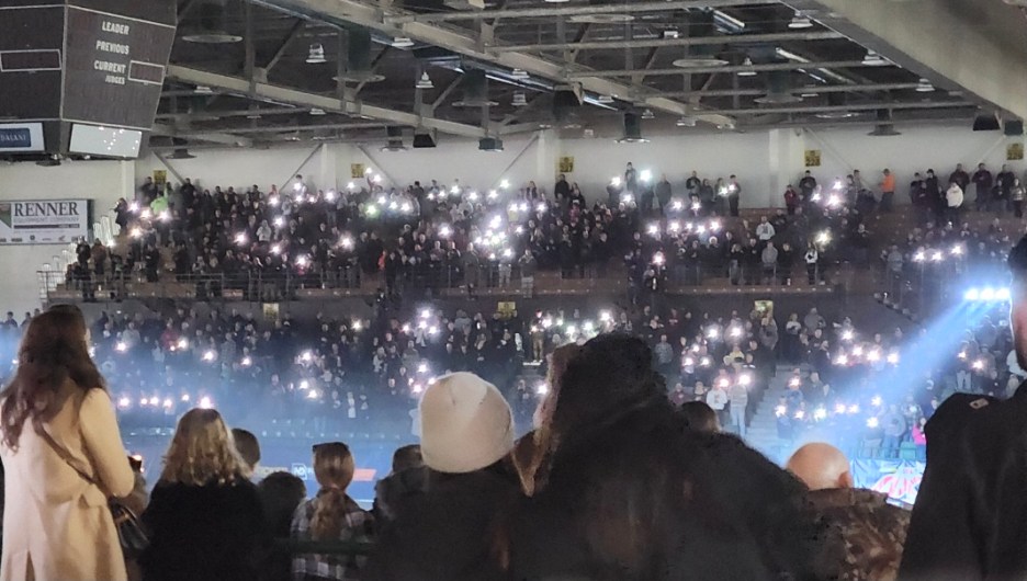 Continuing “With walkups the event was s sellout. Prior to the racing there was a special presentation of the National Anthem. The arena lights were darkened and attendees held their smartphones with the spotlight on throughout the playing of the National Anthem.”