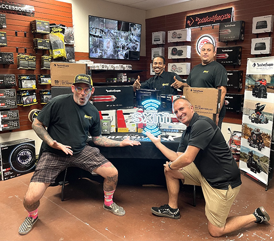 The Slangin’ Sound crew in the R&D showroom with the SiriusXM neon sign they won in the raffle. Nina Contreras, SiriusXM, snapped the image.