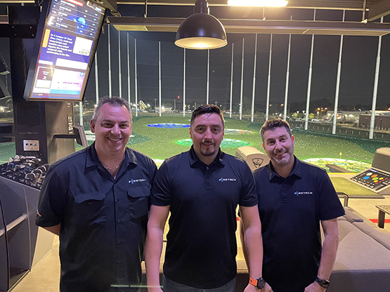 Jason Ewing, Bruno Berg and Chuck Ottati paused for a quick image with the Top Golf range in the background Monday night.