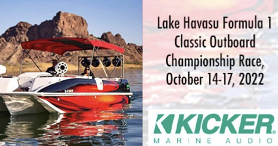 STILLWATER, OK (10.11.22) – KICKER Marine Audio is heading to Lake Havasu City, AZ to join its local dealers and fans for the Anderson Toyota Lake Havasu Classic Outboard Championships October 14-17, which features two days of high-horsepower racing excitement in three classes: Formula 1, Tri Hull and Formula Lite division. The race is sanctioned by the American Powerboat Association (APBA) and draws international powerboat racing stars.