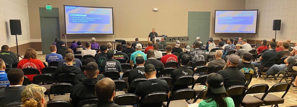 Wayne Harris, of Term-PRO, is one of several presenters that traveled to all 4 of the 2022 series of events: Las Vegas, Indianapolis, Orlando and Dallas. Harris presented a workshop focused on the development of high-performance subwoofer enclosures. The presentation included a strategic overview of the design process and a review of various enclosure types. Attendees learned how to use the Term-PRO enclosure design application to design each enclosure type and interpret the results. Real-world implementations of the enclosures provided attendees with an opportunity to compare the acoustics for each design. Each workshop concluded with a Q&A session.
